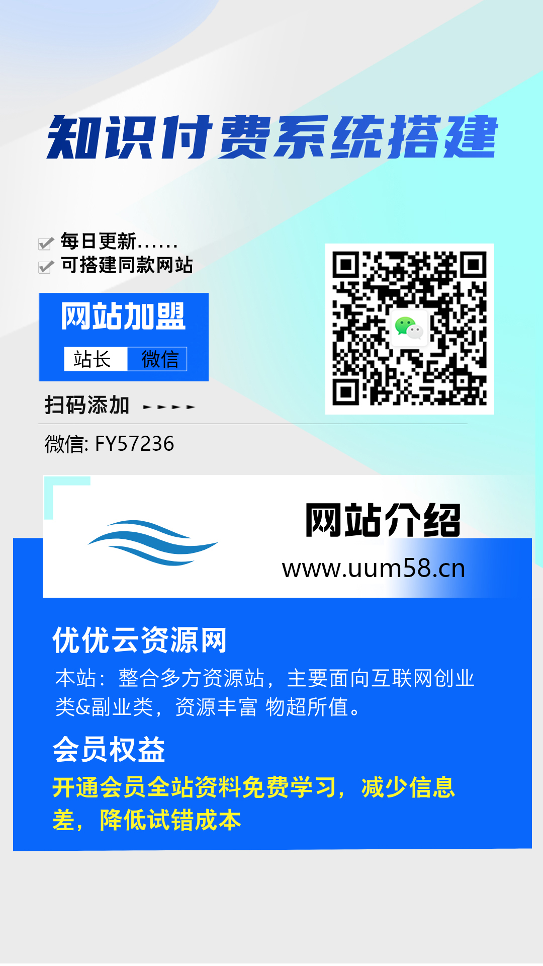 加盟优优网创,加盟搭建同款知识付费资源网站,实现长期稳定被动收入~